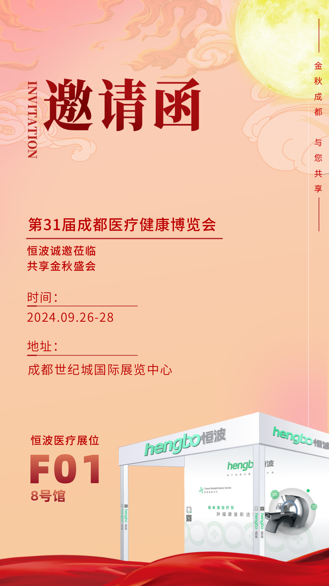 2024年9月26日-28日,由四川省醫(yī)院協(xié)會、四川省醫(yī)療器械行業(yè)協(xié)會、四川省醫(yī)藥行業(yè)協(xié)會、成都市健康服務業(yè)商會支持,成都世紀康博會展有限公司主辦的第31屆成都醫(yī)療健康博覽會即將在成都世紀城國際展覽中心8號館開幕!恒小波誠邀小伙伴們參觀、洽談共謀合作之路!
