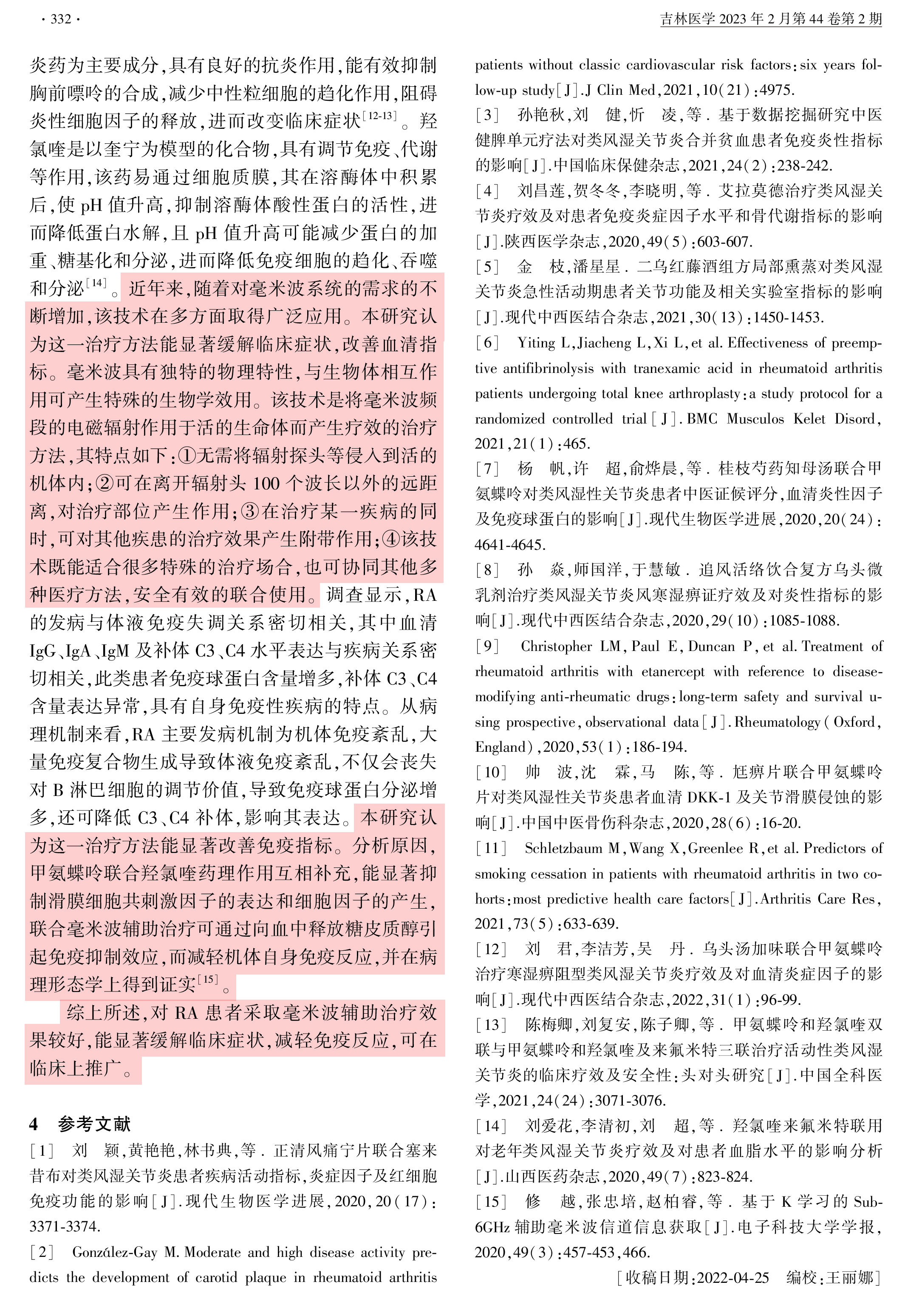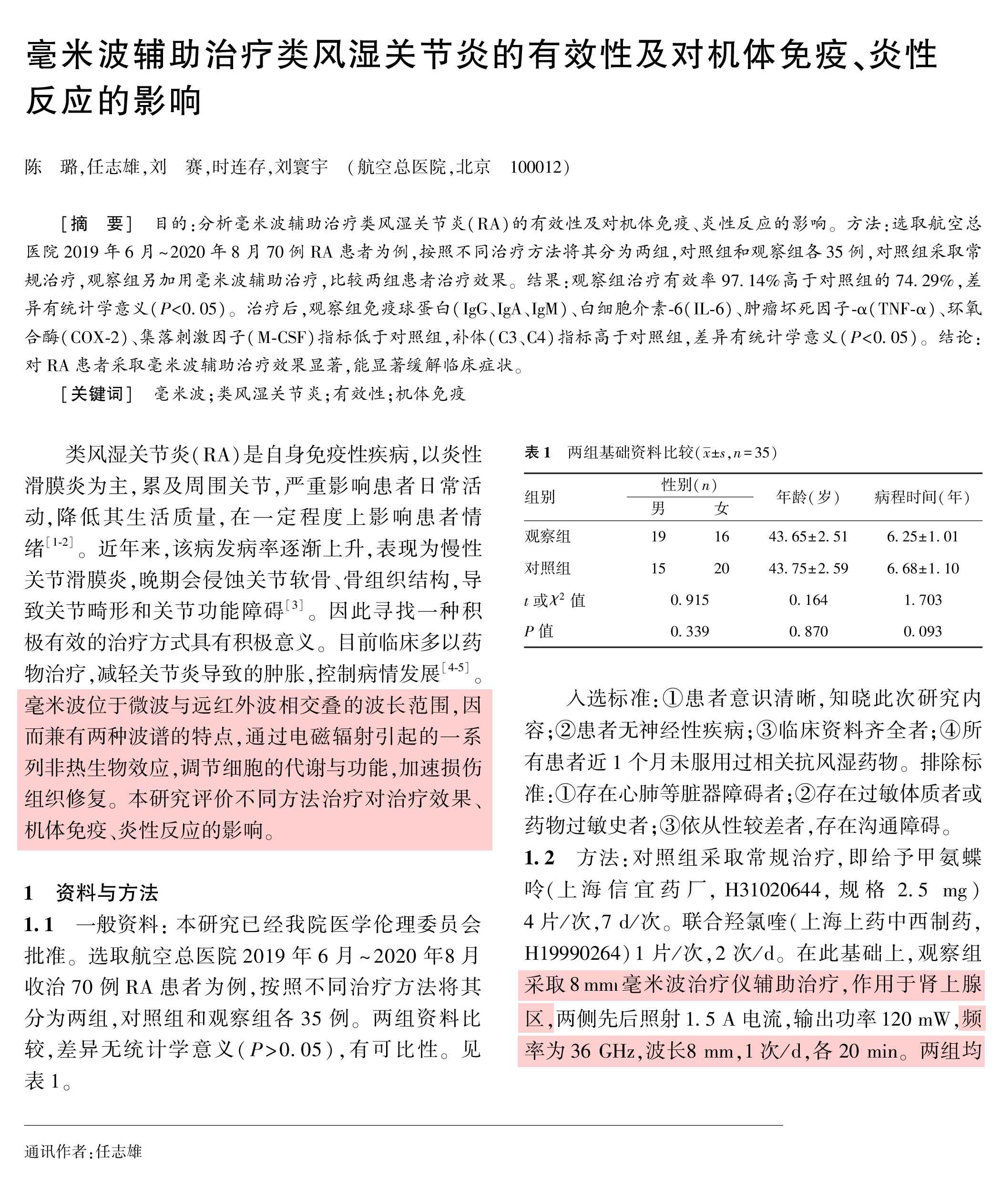 毫米波輔助治療類風(fēng)濕關(guān)節(jié)炎的有效性及對機體免疫、炎性反應(yīng)的影響